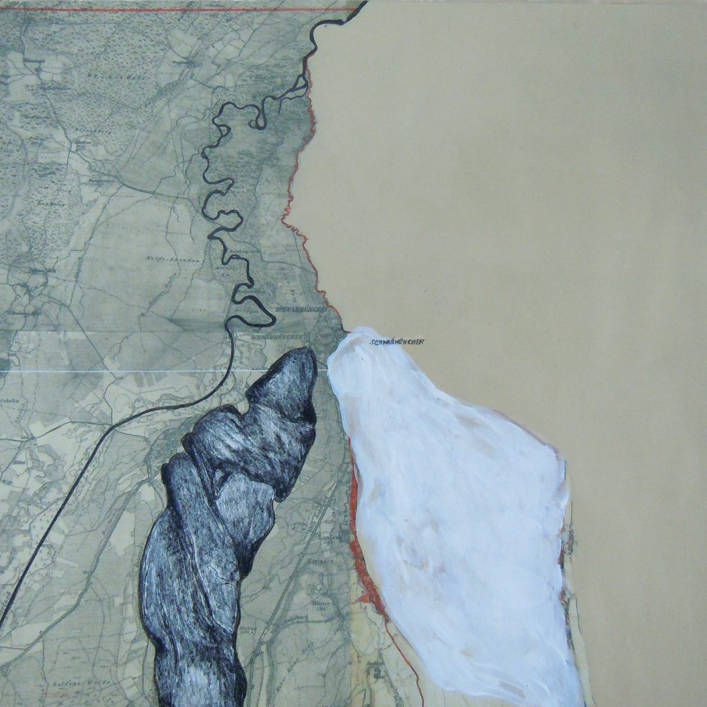 In diesem inspirierenden Rahmen entstand eine Serie von Übermalungen historischer Landkarten der Region. Jede unabhängige Bildkomposition erzählt dabei ihre eigene Geschichte.